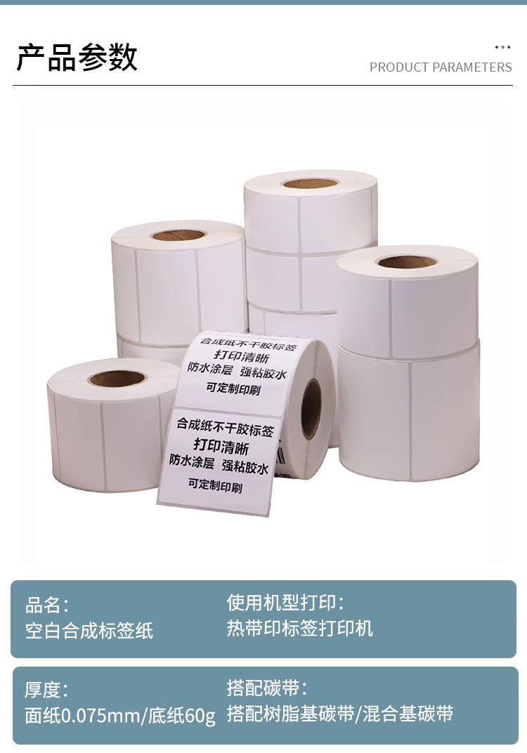 產(chǎn)品詳情product details合成紙是市場上廣泛應(yīng)用的一種不干膠材料,合成紙包含PP合成紙,熱敏合成紙,PET合成紙,PVC合成紙,亞銀合成紙等, 其特點是防水、防油、撕不破,撕不破,印刷效果美觀等特點,廣泛應(yīng)用于藥品、食品,倉儲、工業(yè)、飲品、電器、文化用品的信息及合格證標(biāo)簽。