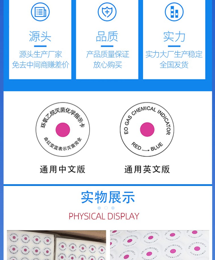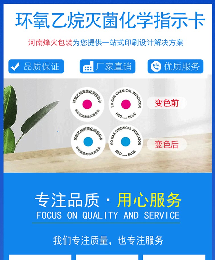 環(huán)氧乙烷滅菌指示標(biāo)簽采用不干膠貼片形式,標(biāo)簽上印有熱敏化學(xué)材料,既可以放入物品包裝內(nèi)使用,也可貼于滅菌包表面,在所要求的滅菌條件下指示色標(biāo)顏色由紅色變成藍(lán)色,滅菌后的顏色不易褪色。