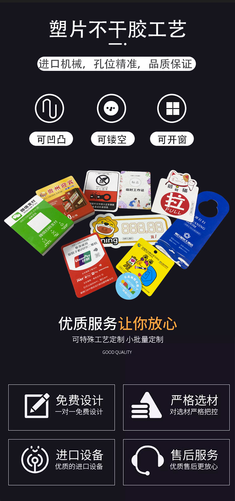PVC異型卡在商業(yè)應用廣泛,具有美觀精致,防水防油,耐刮耐磨不變形的特點。可以做不帶膠的,也可以背膠,可定制任意形狀尺寸和圖案。