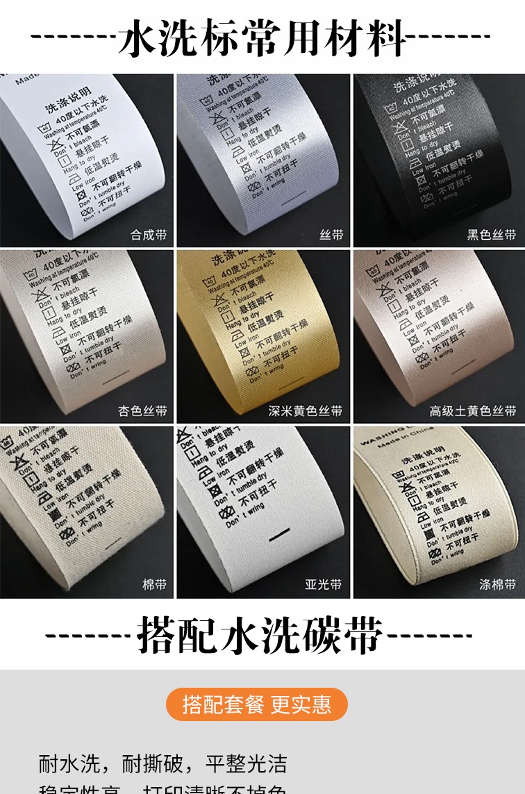 水洗標(biāo)是服裝、家紡、箱包等行業(yè)中用于標(biāo)明產(chǎn)品參數(shù)和洗滌注意事項(xiàng)的特殊材質(zhì)標(biāo)簽,也叫洗水標(biāo)、水洗嘜、洗嘜、布標(biāo)等。由特殊材料制成,區(qū)別于普通紙質(zhì)標(biāo)簽,具有耐洗滌、不掉色的特性。