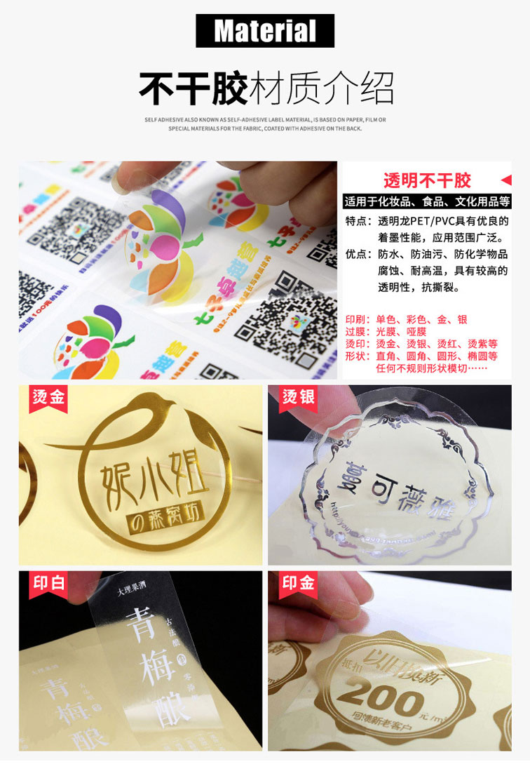 產(chǎn)品詳情product details透明不干膠標(biāo)簽是一種以透明膜為基材的標(biāo)簽,具有高透明度、防水防油、耐高溫等特點(diǎn),廣泛應(yīng)用于食品飲料、日化用品、電子產(chǎn)品等領(lǐng)域。